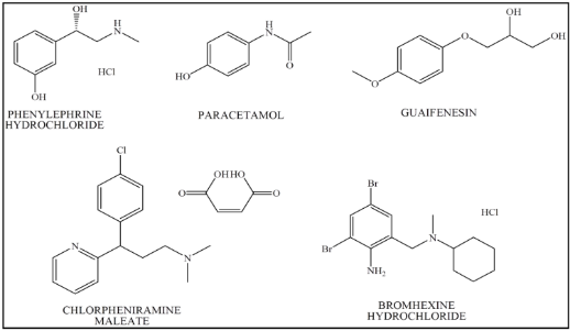 The mixture of phenylephrine hydrochloride (PEPH), paracetamol (PCM), guaifenesin (GNF), chlorpheniramine maleate (CPM) and bromhexine hydrochloride (BRM) is the one most widely used the combination for cough and cold therapy. It is mainly used in diseases accompanied by cough, pain and fever, common cold and other viral infections and also used as an analgesic, antipyretic, decongestant, antihistaminic and antitussive. Phenylephrine hydrochloride (PEPH) (fig. 1), (R)-3-[-1-hydroxy-2-(methylamino)ethyl]phenol, has a decongestant property; paracetamol (PCM) (fig. 1), N-(4-hydroxyphenyl)acetamide, is a mild analgesic; guaifenesin (GNF) (fig. 1), (RS)-3-(2-methoxyphenoxy)propane-1,2-diol, is used as an expectorant; chlorpheniramine maleate (CPM) (fig. 1), 3-(4-chlorophenyl)-N,N-dimethyl-3-pyridin-2-yl-propan-1-amine, is used as an antiallergic and bromhexine hydrochloride (BRM) (fig. 1), 2,4-dibromo-6-{[cyclohexyl(methyl)amino]methyl} aniline, is used as a secretolytic.
