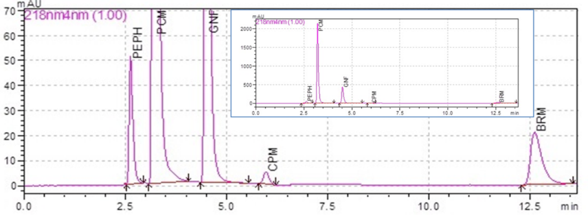 Fig. 2: HPLC chromatogram of sample solution containing 10 ppm PEPH, 450 ppm PCM, 100 ppm GNF, 2 ppm CPM and 8 ppm BRM