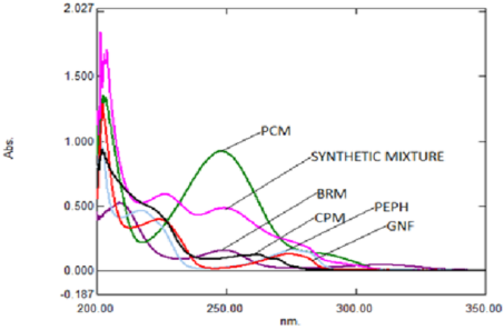 For UV chemo metrics, twenty commercial tablets were accurately weighed and powdered. An amount of powder equivalent to 45 mg of PCM, 0.8 mg of BRM, 10 mg GNF, 1 mg PEPH and 0.2 mg of CPM was taken in 25 ml volumetric flask. To this powder, standard addition of 20 mg PEPH, 20 mg CPM and 20 mg BRMwas done, owing to their too much low quantity (below LOD of the UV range) in the formulation. This powder mixture was dissolved in sufficient quantity of methanol and sonicated for 10 min. The volume was then made up to the mark with the methanol. This solution was filtered through Whatman filter paper (No. 42) so as to remove undissolved tablet excipients. From this filtered solution, 0.1 ml aliquot was taken and was further diluted to 10 ml with methanol.