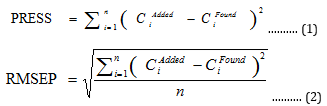 #r2 and regression equation for the predicted concentration versus true concentration plot, $ Mean value of three determinations for three concentrations, *Mean recovery of the predicted concentrations at 80%, 100% and 120% level of standard addition for n=3 replicates
