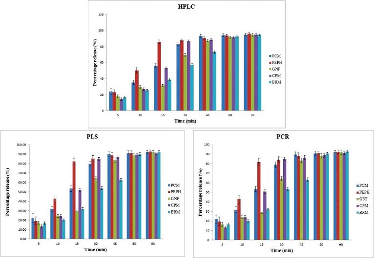 Fig. 5: Dissolution profiles of PEPH, PCM, GNF, CPM and BRM analysed by HPLC, PLS and PCR method showing the percentage release of the five components at different time points (5, 10, 15, 30, 45, 60 and 90 min) for n=6 replicates