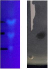 Fig. 4: TLC profile and the result of bioautography of IP-4 extract. TLC was done using plate silica gel F254 plate as stationary phase and toluene: ethyl acetate: formic acid (6:3:1 v/v/v) as mobile solvent system