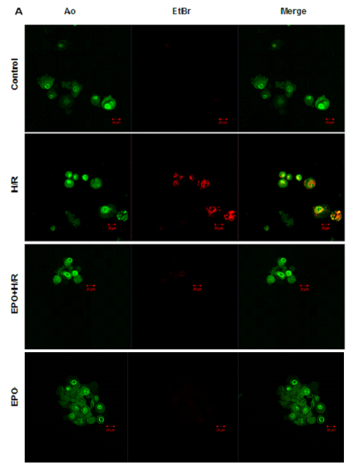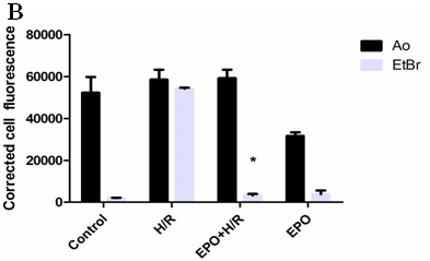 To distinguish viable cells from apoptotic and necrotic cells, Ao and EtBr double staining method was used. Control and rhEPO treated myocytes stained uniform green color because they can maintain membrane integrity (fig. 3A and 3C). Whereas H/R-induced myocytes lost membrane integrity so EtBr could enter and intercalated with DNA. Late apoptotic myocytes showed bright orange nuclei and necrotic myocytes showed red nuclei as showed in the fig. 3B. Data are presented as means±SEM of the ratios from three independent experiments.* denotes p<0.05 for analyses compared to H/R.