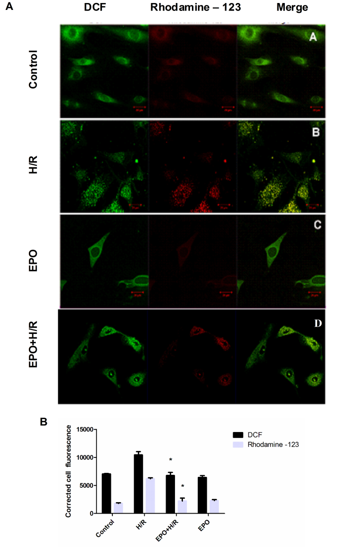 In control and rhEPO treated myocytes, fluorescence emitted by Rhodamine-123 appeared only in the perinuclear region where the mitochondria is located as showed in the fig. 4A and 4C. DCFH-DA crosses the cell membranes and the mitochondrial membrane by deacetylation and oxidation. This is facilitated by esterases and ROS in the cytoplasm and mitochondria. In H/R-induced NCM, Rhodamine-123 fluorescence colocalized with DCF fluorescence not only the perinuclear region but also in the cytoplasmic region and there was an increase in DCF fluorescence in H/R when compared to rhEPO pretreated NCM (fig. 4B). Data are presented as means±SEM of the ratios from three independent experiments.* denotes p<0.05 for analyses compared to H/R. Accordingly rhEPO stabilizes Δψm and ROS in H/R-induced NCM.