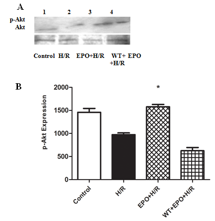 Fig. 5A depicts the phosphorylation of Akt in H/R-induced myocytes. NCM pretreated with rhEPO post-H/R showed a significant increase in phosphorylation of AKT in lane 3 of pAkt as compared to cells exposed to H/R. Expression of AKT in the corresponding row is not altered. This increase in phosphorylation of AKT was blocked by WT. Data are presented as means±SEM of the ratios from three independent experiments. * denotes p<0.05 for analyses compared to H/R.