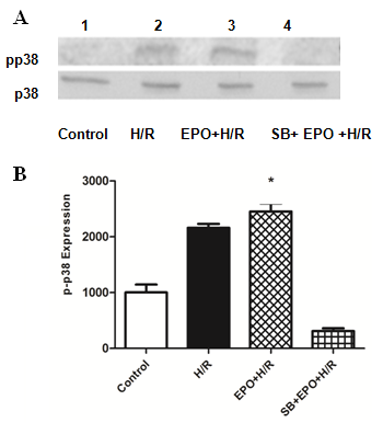 Fig. 6A depicts the phosphorylation of p38 MAPK in H/R-induced myocytes. NCM pretreated with rhEPO showed an increase in p38 MAPK phosphorylation in lane 3 when compared to control and H/R. The phosphorylation of p38 MAPK was blocked by SB203580. Expression of p38 MAPK (loading control) in the corresponding row is not altered. Data are presented as means±SEM of the ratios from three independent experiments. * denotes p<0.05 for analyses compared to H/R.