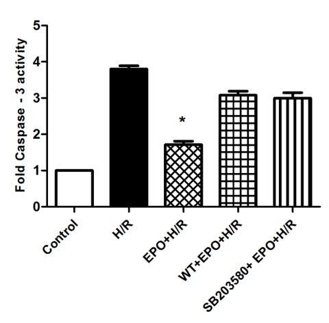 NCM were induced with H/R with or without rhEPO treatment and caspase-3 activity was measured. The caspase-3 activities were markedly elevated after H/R. Pretreatment with rhEPO prevented the caspase-3 proteolytic activations induced by H/R. Further myocytes blocked with WT and SB203580 showed increase caspase-3 activity as showed in fig. 9. Data are presented as means±SEM of the ratios from three independent experiments.* denotes p<0.05 for analyses compared to H/R.
