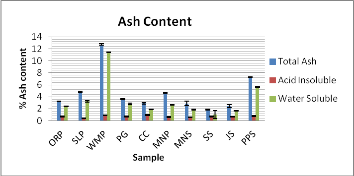 Acid insoluble ash ranged from 0.38±0.05% to 0.94±0.05 in sweet lime peel (SLP) and cucumber peel (CC) accordingly. Water soluble ash was highest in WMP i.e. 11.44±0.05% and found lowest in SS i.e. 1.04±0.69% (graph 1). Evaluation of total ash specifies the purity of the sample by indicating the existence of foreign matters like metallic salts or silica. It has been also noticed that in all plants water soluble ash content is more than acid-insoluble ash content. This reveals the lower amount of acid insoluble siliceous matter than that of water-soluble ash [24].