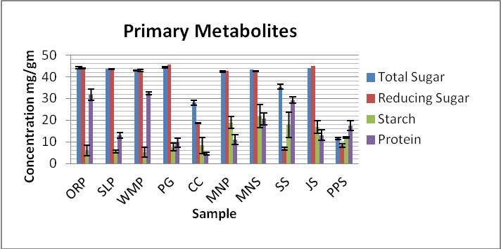 All the selected fruit waste parts were evaluated quantitatively for the analysis of total sugar, reducing sugar, starch and protein (graph 2). It has been found that fruit waste materials are rich in metabolites which are involved in the normal growth and also very useful in flavoring, fragrances, in insecticides, sweeteners and natural dyes [25].