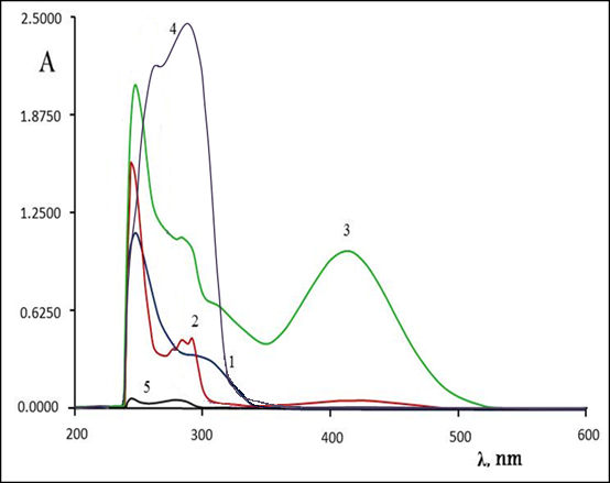 Fig. 1: UV-Vis spectra in chloroform of: 1-5.0x10-5 mol/l of RSV; 2-1x10-4 mol/lof BCG; 3-5.0x10-5 mol/l ion-pair complex (5.0x10-5 mol/l of RSV with 1.0x10-4 mol/l of BCG);4-5.0x10-5 mol/l of FEN; 5-5.0x10-5 mol/l of ASP {blank ischloroform, ℓ =1 cm}