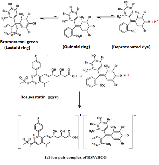 The colour of such dyes is due to the opening of lactoid ring and subsequent formation of quinoid group (deprotonated). Rosuvastatin is protonated and forms ion-pair with the dye. Each drug-dye complex with two oppositely charged ions (positive on the drug and negative on the dye) behaves as a single unit held together by an electrostatic binding [47-49]. The suggested mechanism of RSV-BCG ion-pair complex formation is shown in Scheme 3.