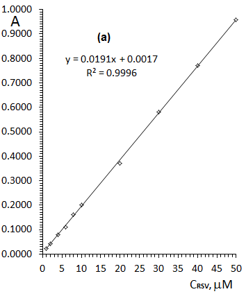 The stock solution was further diluted daily just before the use to obtain working solutions of RSV in the concentrations: 1, 2, 4, 6, 8, 10, 20, 30, 40 and 50 μM (0.482, 0.963, 1.926, 2.889, 3.852, 4.815, 9.631, 14.446, 19.262 and 24.077 μg/ml) by transferring different aliquots from stock standard solution (b): 0.1, 0.2, 0.4, 0.6, 0.8, 1.0, 2.0, 3.0, 4.0 and 5.0 ml into 10 ml volumetric flasks, then 1 ml from stock standard solution of BCG was added, diluted to 10 ml with chloroform.