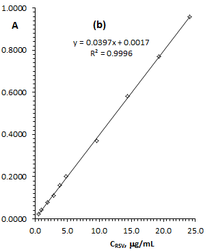 The spectra characteristics of the method such as the molar absorptivity (e), lmax, Beer's law, regression equation {at lmax= 416 nm (y=a. x+b); where y=absorbance, a=slope, x=concentration of RSV in μM or μg/ml,b=intercept} the correlation coefficient, limit of detection (LOD) and limit of quantification (LOQ) are summarized in table 1 and 2.