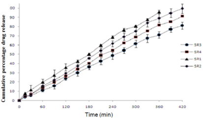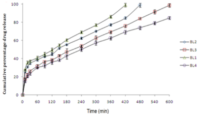 BL tablets designated as BL1 to BL4, were prepared with optimum formulations of IPR and SR layer. BL tablets immediately released a fraction of the loaded drug ranging from 23-37% within first 30 min of dissolution study in acid solution of pH 1.2. Thereafter, it slowly released the remaining amount of drug. While drug release from BL1 tablet extended up to 7 hr, BL4 released 70% of the drug in 10 hr [fig 4].
