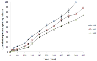 Where, P is the number of dissolution time points, and R and T are the mean percentage drug released at each time point t from the reference and test samples respectively. It was found that the values of f1 and f2 were 62.44 and 9.67 respectively. No significant difference [p<0.05] was obtained from students t test between f1 and f2 values of the two SR tablets. This indicated that the release profiles of the tablets SR3 and SR5 did not vary appreciably and hence SR5 tablet was selected for the preparation of the bi-layer tablets. In order to further prolong the drug release, SR tablet designated as SR6, SR7 and SR8 were prepared, wherein, SAL was substituted with increasing amount of high viscosity CMC. The release profiles [fig 3]revealed that increase in the amount of CMC, decreased the drug release.