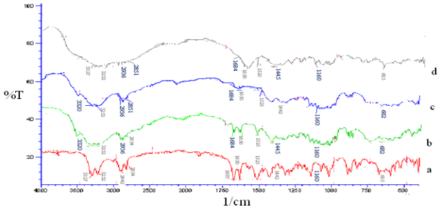 Fig. 5: FTIR trace of a) GPZ, b) Solid dispersion of GPZ/Physical mixture of IPR tablets, c) powdered IPR tablets d) powdered SR tablets