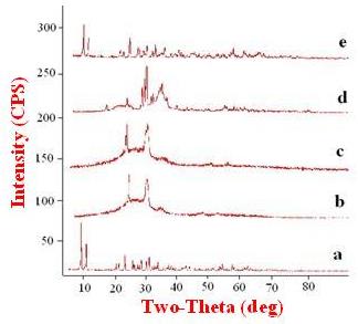 Fig. 7: XRD pattern of a) GPZ, b) Gelucire 44/14, c) Physical mixture of IPR tablets, d) powdered IPR tablets, e) powdered SR tablets