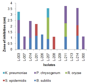 As seen from fig. 1b, when tested for antimicrobial activity, most of the isolates showed activity against Gram-positive bacteria (S. epidermidis and B. subtilis) and fungi (P. chrysogenum and R. oryzae). Amongst these, 25% isolates were active against only Gram-positive bacteria, and 50% were active against both Gram positive bacteria and fungi. L-003 showed maximum antibacterial activity against B. subtilis and L-208 showed maximum activity against S. epidermidis while L-201 and L-214 showed antibacterial activity against both of these. L-003, L-007, L-014, L-211, L-214 and L-300 showed antifungal activity against P. chrysogenum; L-207 was antagonistic to R. oryzae while L-211 showed antifungal activity against both these fungi. None of the endophyte showed activity against the tested Gram negative bacteria.