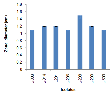 Siderophore production was exhibited by 58% of the endophyte (fig. 1c). L-003, L-014, L-201, L-206, L-208, L-209 and L-300 showed siderophore production. L-208 showed the maximum activity, as measured by the diameter of the orange halo zones.