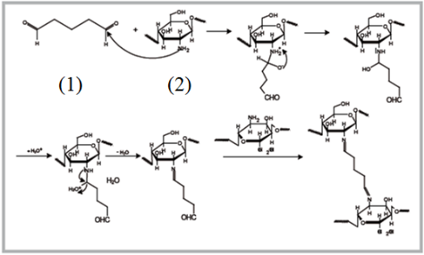 Fig.1: Cross-linking reaction of glutaraldehyde (1) and chitosan (2) [15]