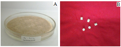 Fig.2: Formulation process of bovine hydroxyapatite-chitosan-ciprofloxacin implants using glutaraldehyde, A) dry granules, B) implants (cylindrical pellets)