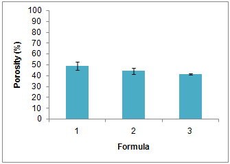 The porosity of the implant with three different concentrations of glutaraldehyde is shown in Fig.4. Porosity of F3 (1.0% glutaraldehyde) was significantly different with F1 (0.5% glutaraldehyde) (*P<0.05). Increasing glutaraldehyde concentration of 1% caused a decrease in porosity than 0.5% glutaraldehyde. The increase of glutaraldehyde concentration caused the structure of the implants became more compact. Glutaraldehyde affected network size which was formed between chitosan chains. The increase of glutaraldehyde concentration led to the size of the network became smaller, so that the pores diameter also decreased [26].