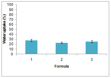 Water uptake of formula 1 (0.5% glutaraldehyde) was significantly different from formula 3 (1.0% glutaraldehyde) (**P<0.01). The increase of glutaraldehyde concentration to 1.0% caused markedly decrease in implant water uptake capacity. Cross-linking process with glutaraldehyde restricted water molecules to enter into chitosan structure [27]. Therefore, the highest concentration of glutaraldehyde (1.0%) produced an implant with the lowest water uptake capacity. Percent water uptake of F1 to F3 formulation can be seen in fig. 6.