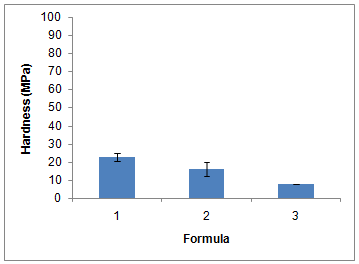 Hardness of the implants (F1 to F3) is as shown in fig. 7. The increase of glutaraldehyde concentration to 1.0 % in F3 caused a significant decrease of implants hardness compare to F1 and F2. Using high concentration of glutaraldehyde as cross link agent caused modification of implants structure became amorph [30]. Cross-linking process using glutaraldehyde caused the characteristic of biomaterial became brittle. Increasing glutaraldehyde as cross-link agent more than 0.2 % decreases the mechanical strength of the implants [31].