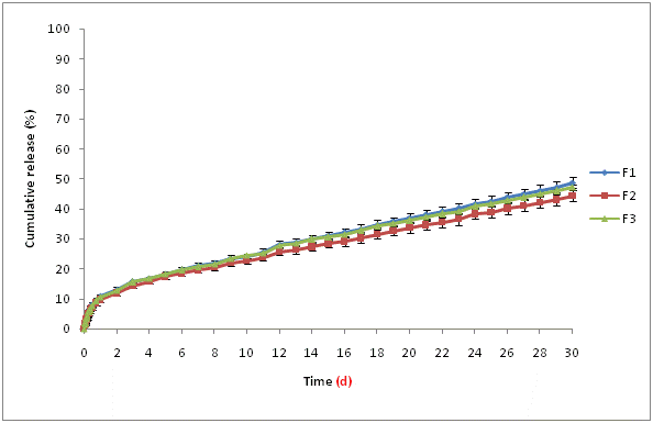Fig. 9: Ciprofloxacin release profile of F1 to F3 formulations