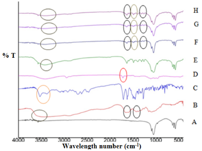Fig.10: FTIR spectrum of, (A): Bovine hydroxyapatite; (B): Chitosan; (C) Ciprofloxacin; (D) Glutaraldehyde; (E) Implants before cross-linking process; (F): Formula 1; (G): Formula 2; (H): Formula 3