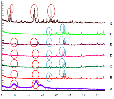 Fig.11: X-ray diffraction spectrum of (A): Chitosan; (B): Implant before cross-linking process; (C) Formula 1; (D) Formula 2; (E) Formula 3; (F): Bovine Hydroxyapatite; (G): Ciprofloxacin