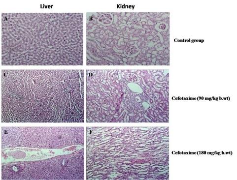 Conclusions: It could be concluded that administration of cefotaxime induced some adverse effects on biochemical parameters as well as histopathological changes in liver and kidney.