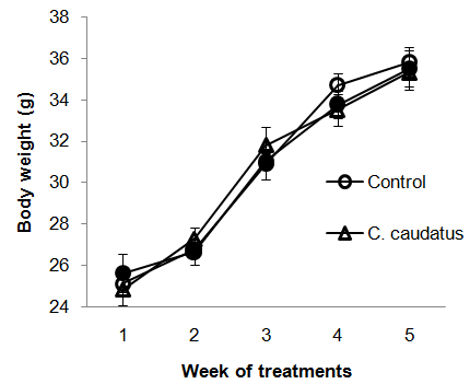 Similarly, another author reported that there were no adverse effects on the body weight of animals given Cosmos caudatus extract (100, 500 and 1000 mg/kg BWT) for 21 d [22]. Our data on Piper sarmentosum also in agreement with other researchers who reported that daily consumption of Piperaceae species gives no effect on body weight [23]. Overall, these suggest that supplementation of Cosmos caudataus and Piper sarmentosum may be beneficial in body weight management.