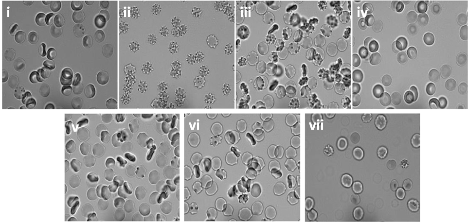 Fig. 1: Optical microscopic evaluation of the erythrocyte morphology. (i) Control–RBCs; (ii) RBCs plus oxidant; (iii) RBCs plus O. tenuiflorum extract; (iv) RBCs plus L. aspera extract; (v) RBCs plus T. arjuna extract; (vi) RBCs plus G. glabra extract; (vii) RBCs plus N. arbortristis extract at 50 μg/ml and oxidant after 1 h of incubation