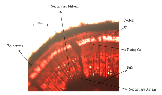 The transverse section of stem shows the following characteristic features epidermis is single layered, quadrangular cells. Cortex is many layers of thin walled cellulosic parenchyma. Pericyclic fibers, pith, are thin walled, lignified big polygonal parenchyma with intercellular space. The vascular bundles are composed of xylem and phloem cells were shown in fig. 2
