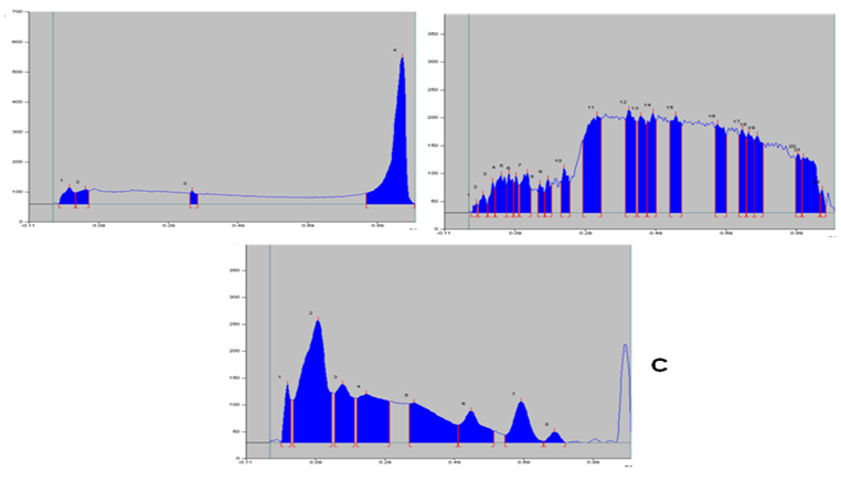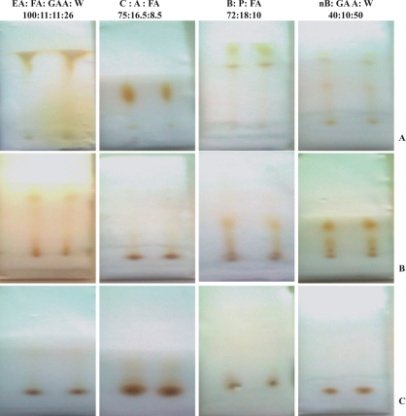 Fig. 4: TLC of chloroform extract (A), ethanol extract (B) and aqueous extract(C) of Abutilon indicum stem