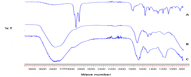The IR spectra of chloroform, alcoholic and aqueous extract of Abutilon indicum stem were scanned on FT-IR Agilent-630 over the frequency range from 4000-650 cm-1. The spectra were plotted against Wave number cm-1 Vs Transmittance (%) [25].