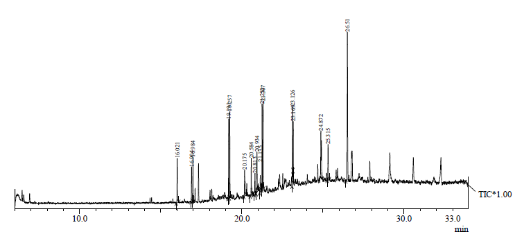 | 2 | 1-Nonadecene: C19H38; MW: 266 | 16.904 | 629970 | 3.39 | ![]() |