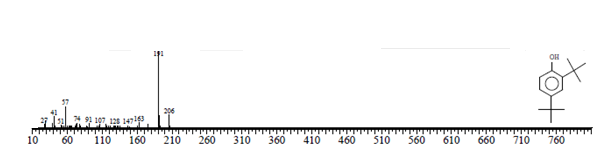 | 1 | Phenol, 2, 4 bis(1,1dimethylethyl) Phenol: C14H22O; MW: 206 | 16.011 | 967298 | 5.20 | ![]() |