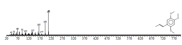 | 3 | 1, 2, 4-trimethoy-5-(1-propenyl) benzene: C12H16O3; MW: 208 | 18.911 | 369336 | 36.43 | ![]() |