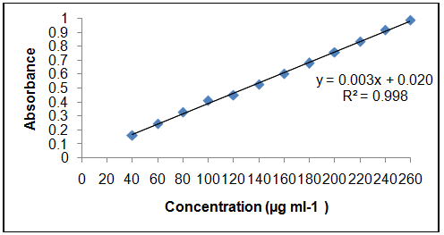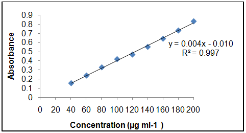 Calibration graphs were plotted for BU at 289.0 nm and NA at 283.8 nm at a concentration range of 40-200 µg ml-1 for BU and 40-260 µg ml-1 for NA, respectively as shown in fig. 3 & 4.