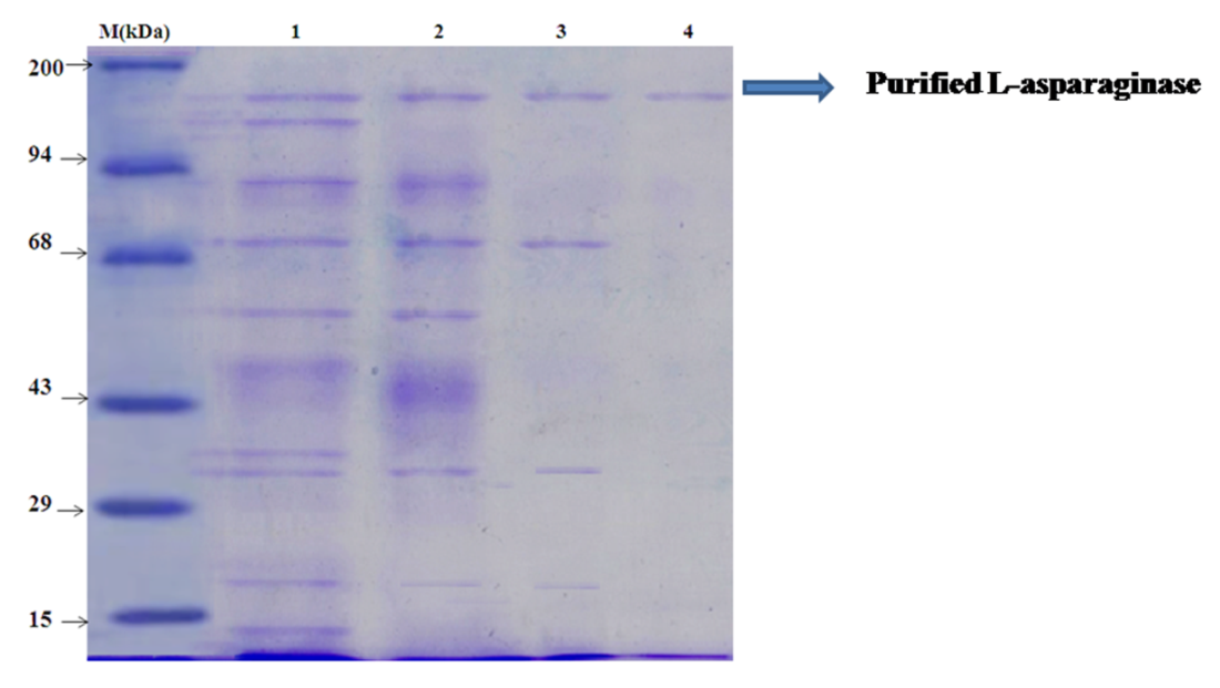Fig. 3: SDS-PAGE analysis of L-asparaginase produced from Pseudonocardia endophytica VUK-10at various stages of purification. Separation was performed on a 10 % (w/v) SDS-polyacrylamide gel and stained with commassie brilliant blue. From left to right: lane M, molecular weight markers; lane 1, Crude enzyme extracts; lane 2, Partially purified protein by ammonium sulphate precipitation; lane 3, Partially purified L-asparaginase on Sephadex G-100 gel filtration chromatography; lane 4, Final purified L-asparaginase on CM-Sephadex C50 Ion exchange chromatography