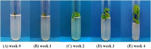 The explants (terminal bud, lateral bud) of P. palatiferum can be grown on MS 1/4X media with no PGR during4 w. In the first week, the explant showed no significant change (fig.1A). After two weeks, plantlets that composed of a primary root, lateral root, leaves, and shoot tip were observed (fig.1B). Plantlets continued to grow in week 3 (fig. 1C), and reached3-4 cm height, with 4-5 leaves within 4 w (fig. 1D).