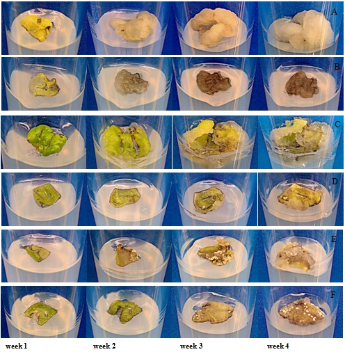 Fig. 2: P. palatiferum callus formation from leaf explant on (A) MS+NAA 5.37 µM; (B) MS+2,4-D 4.52µM; (C) MS+NAA 5.37 µM+2,4-D 4.52µM; (D) MS+NAA 5.37 µM+BAP 0.44µM; (E) MS+2,4-D 4.52µM+BAP 0.44µM; (F) MS+NAA 5.37 µM+2,4-D 4.52µM+BAP 0.44µM during a 4-week culture period