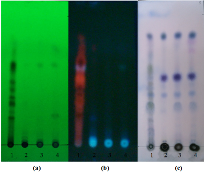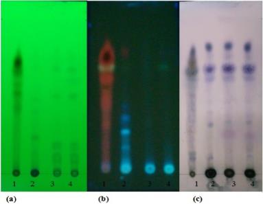 Fig. 4: TLC chromatogram of chemical composition in P. palatiferum leaf extract and callus culture extracts. DVS 2(toluene: chloroform: ethanol 10.0:2.0:0.5), detection made under (a) UV 254 nm (b) UV 365 nm (c) AS reagent