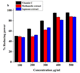 The reducing power was determined according to the method of Oyaizu (1986) [10] with some modifications. Reaction was carried out in a mixture containing 2.5 ml of sample (100, 200, 300, 400 and 500 µg/ml), 2.5 ml of 0.1 M sodium phosphate buffer (pH 6.6) and 2.5 ml of K3Fe (CN)6 (1%, w/v) by incubating at 50 °C for 20 min. After addition of 2.5 ml trichloroacetic acid (10%, w/v), the mixture was centrifuged at 5000g for 10 min. The upper layer (5 ml) was mixed with 0.5 ml of fresh FeCl3 (0.1%, w/v) and the absorbance was measured at 700 nm. Vitamin C was used as the positive control. The percentage reducing power was calculated by using the following formula: