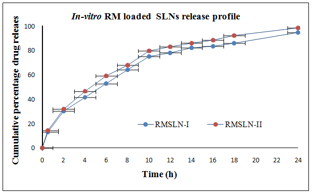 The release kinetics was aiming to find the formulation release behavior at a slow zero or first order rate and those that provide an initial fast release, followed by zero or first order release by controlling manner. That can be maintained the drug concentration in the blood or target tissue at a desired value as long as possible [24, 42]. The formulated RMSLN-I and RMSLN-II percentage release was 94.70±2.16 % and 98.2±1.03 %, respectively. The results of Rasagiline mesylate release indicate, the formulation exhibited a biphasic release pattern. The burst release was happens within 30 min and the left over the drug was found to be released in a controlled manner, over the period of 24 h. The burst release of Rasagiline mesylate was associated with the drug entrapped in the surface layer of the nanoscale solid lipid particles directly dissolves when it comes in contact with the release medium [23]. The formulated particles showed a biphasic release pattern with the initial burst release followed by controlled release. Statistically significant differences were found among the drug release profile from RMSLN-I and RMSLN-II formulations. Applying kinetic mathematical models, the mechanism of Rasagiline mesylate loaded nanoscale solid lipid particles release from the two formulations were found to be followed higuchimodel, as the plots showed high linearity, with a correlation coefficient (R2) value of 0.98 or more. The ‘n’ value of korsmeyer-peppasmodel lies below 0.5 and the mechanism controlling the drug release by diffusion dominated mechanism [22]. The mechanism of Rasagiline mesylate loaded nanoscale solid lipid particles release was found by incorporating the initial 60% of the release data in korsmeyer-peppasmodel.