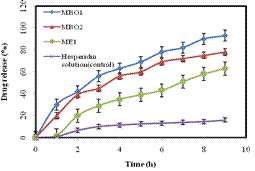 The results of the bioavailability study as shown in fig.(3), table (8) indicate that hesperidin is released and permeated well from the MBO when applied topically as compared micro emulsion E1. The Cmax of hesperidin after topical application of hesperidin MBO and micro emulsion was found to be 30.3 and 11.3 µg/ml respectively.