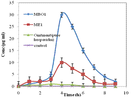 Significant difference in the Cmax values was observed for MBO as well as micro emulsion and simple ointment. The Tmax value for all the formulations was found to be 4h, since the route of administration was topical for all the formulations. The overall mean value of AUC (0-8) for hesperidin MBO was significantly greater than the microemulsion of hesperidin demonstrating improved bioavailability when microemulsion was converted into ointment.