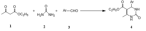 The most convenient and popular reaction that gives easy access to various derivatives of DHPM is the Biginelli reaction [6] which is a multi component condensation employing urea, ethyl acetoacetate and aromatic aldehydes [Scheme-1].